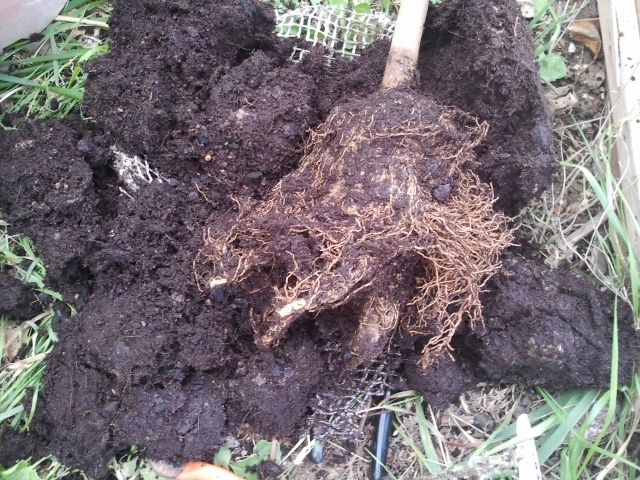 C'est plants ont été cultivés dans une terre argile, les racines ont été nettoyées lors de l'arrachage et une motte en terreau a été reconstituée autour d'un filet.